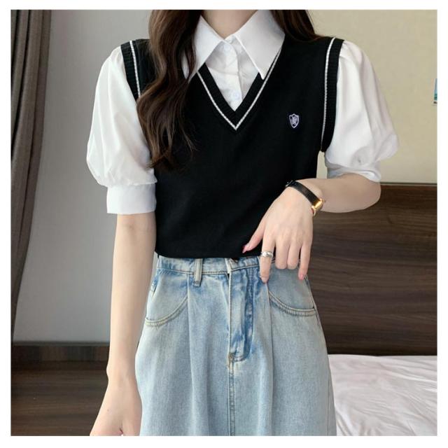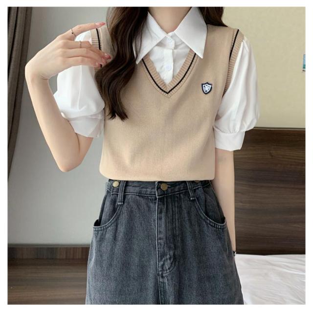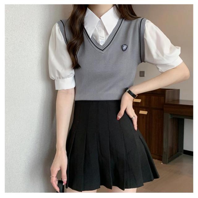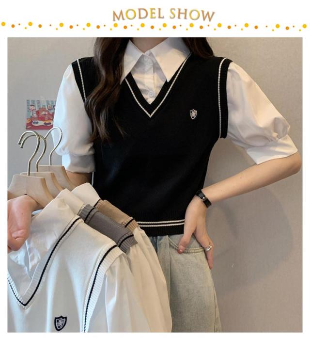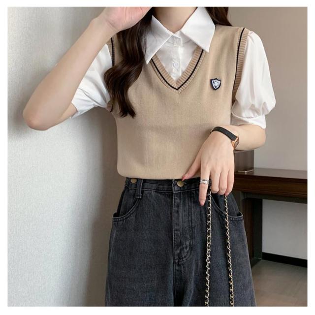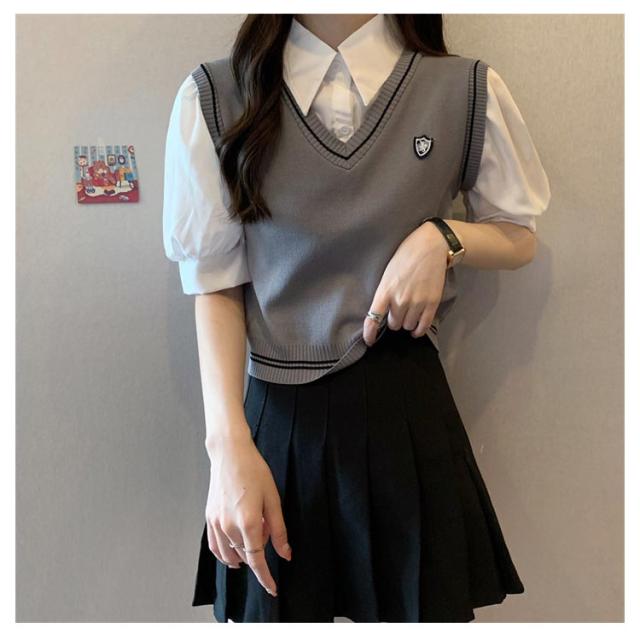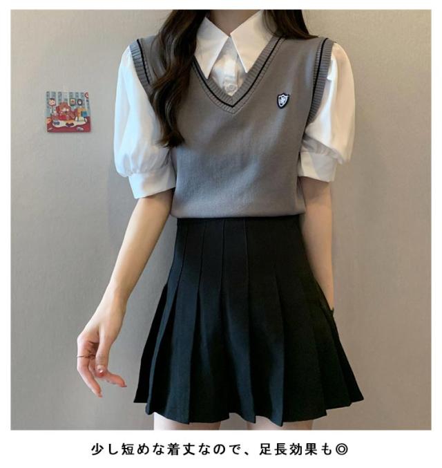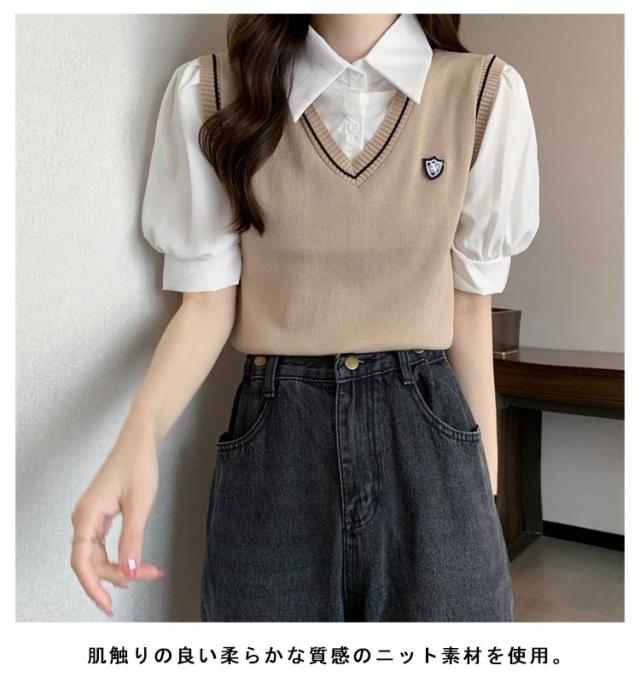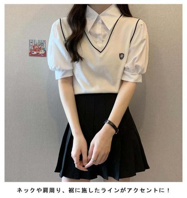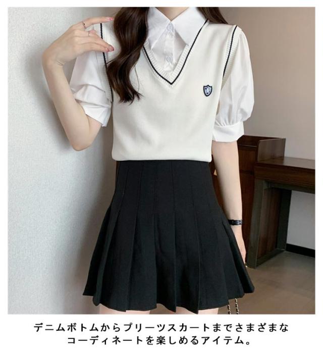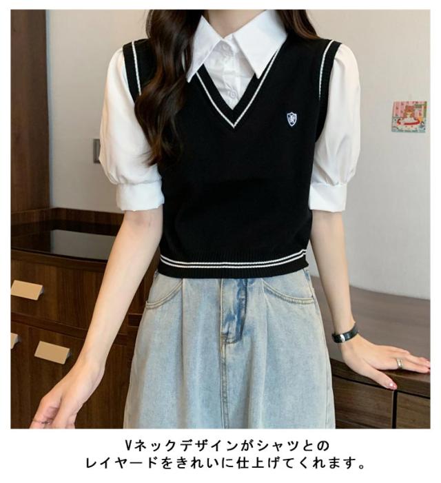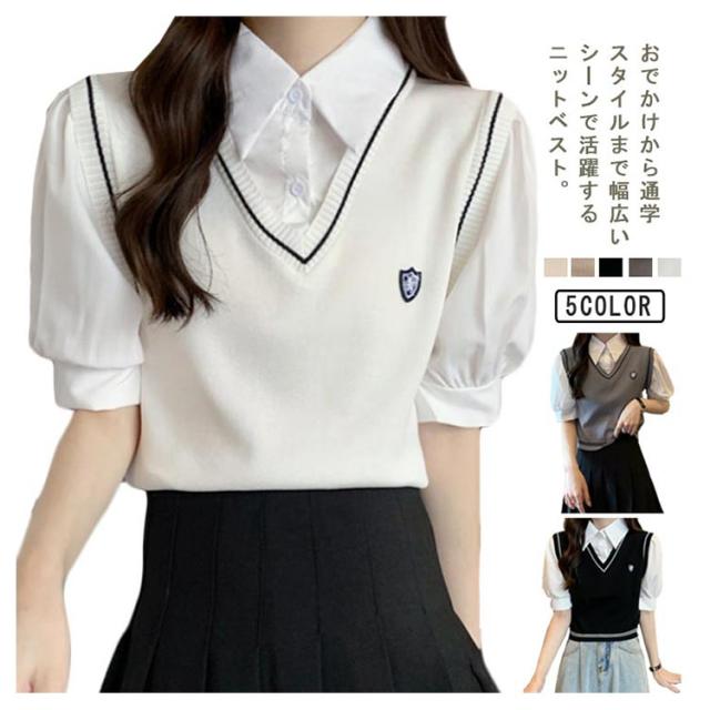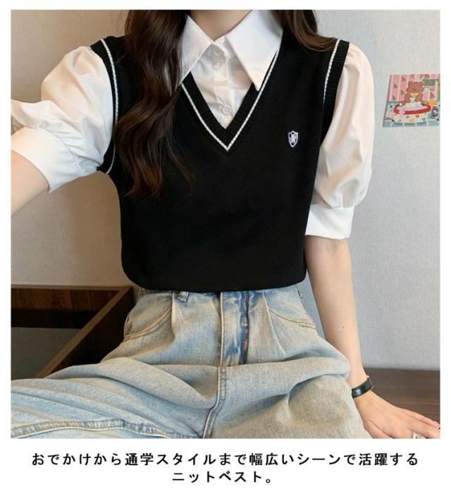 ニットベスト レディース ショート丈 ライン Vネック プルオーバー ベスト スクールベスト 制服 ベスト スクールセーター ノースリーブ トップス 女子高生 通学 学生 中学 高校生 学生服 春 秋 レイヤード 重ね着 カジュアル 韓国 ファッション 送料無料