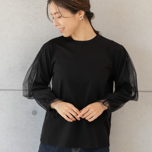 甘さと大人っぽさを兼ね備えたシアースリーブカットソープルオーバー。透け感のある袖が女性らしさを引き立てます。袖口にはフリルディテールを施し、さらなる華やかさをプラス。シンプルながらも個性的なデザインで、どんなスタイルにもマッチします。