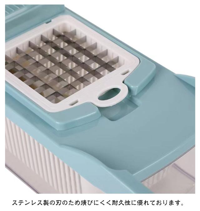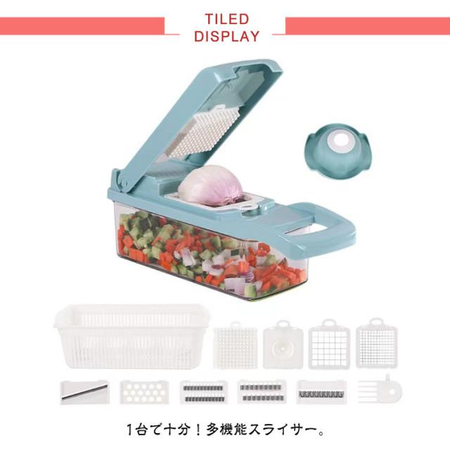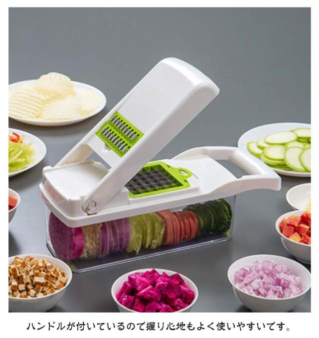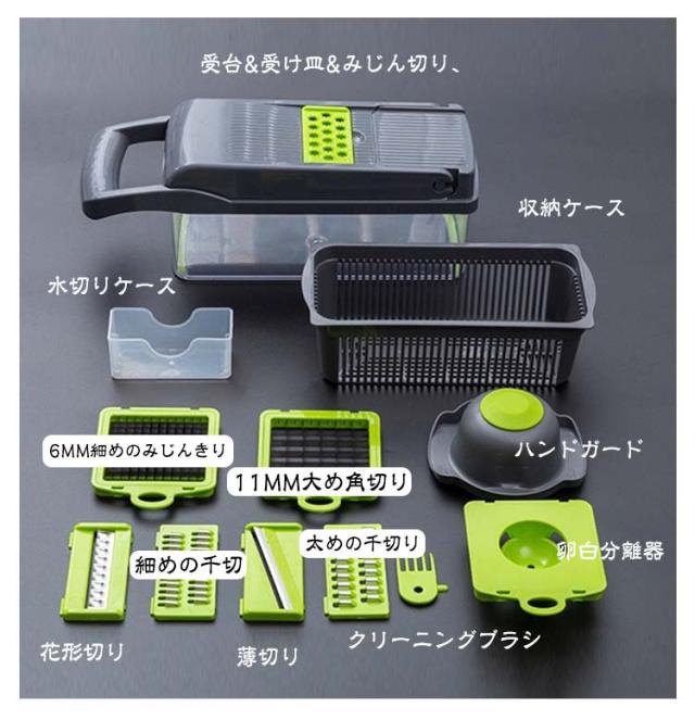 | 【一台8役!】 【多機能スライサー】 【13点セット】 1台で十分!多機能スライサー。 ステンレス製の刃のため靖びにくく耐久性に優れております。 刃は取り外し可能なので刃も本体も手軽に洗浄できます。 収納ケースが付属しており刃物を収納でき、紛失してしまう心配もありません。 ハンドルが付いているので握り心地もよく使いやすいです。 卵白分離器や水切りカゴ、掃除用ブラシなども付属しており、一台だけで十分に満足できる! | |