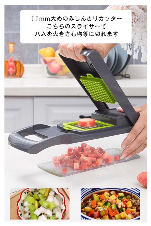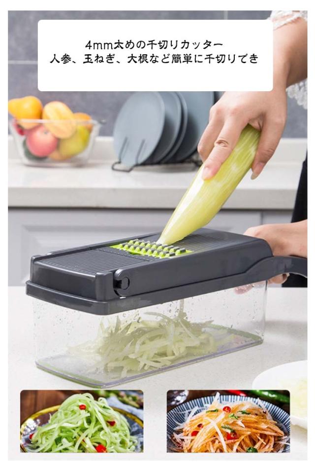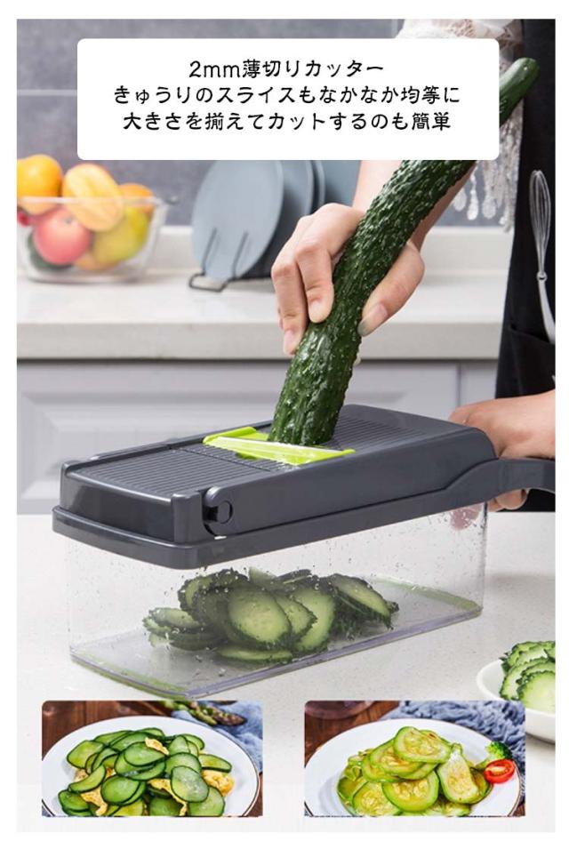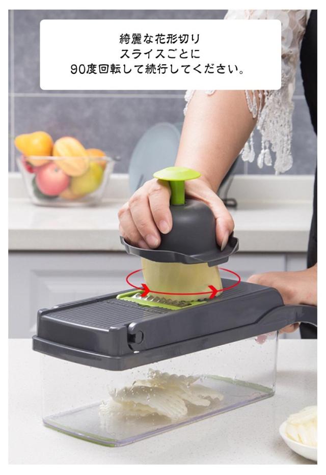 | サイズについての説明 | サイズ:約32*12*12cm(本体) 重さ:約738g セット内容:7種類のカッター、受台、受け皿、水きりケース、卵白分離器、安全ホルダー、クリーニングブラシ カッター種類 |