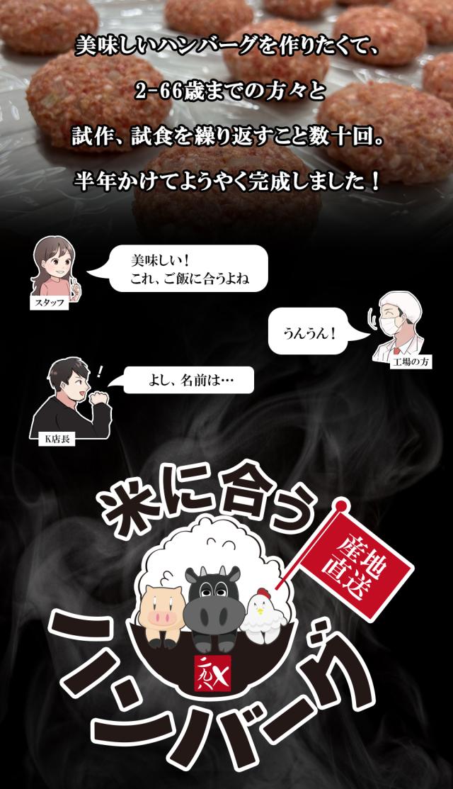 似寄り ハンバーグ が乱立する中、美味しい ハンバーグ が作りたく2-66歳のお肉関係者の方々と 試作・試食を繰り返すこと数十回。開発に約半年かけ完成しました! とにかく、米に合う ハンバーグ だったので、「米に合う ハンバーグ 」という商品名にしました。