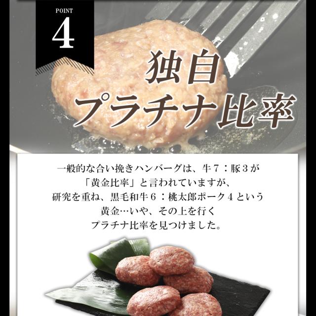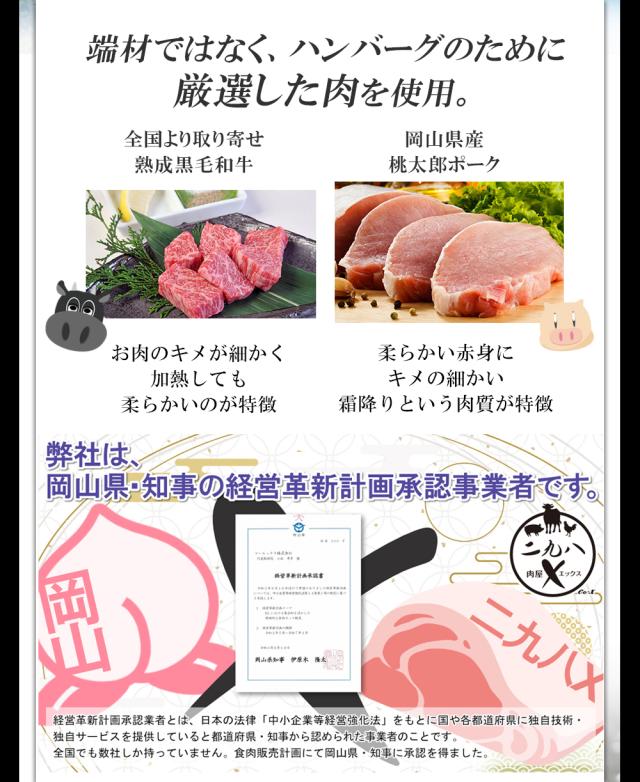 美味しい ハンバーグ に合うお肉を探し求め、 たどり着いたのが「黒毛和牛×岡山県産三元豚」。 黒毛和牛は全国より旬な牛肉を取り寄せ、 豚肉は岡山県産ブランド三元豚「桃太郎ポーク」を選びました。 重要ポイントは「キメのこまかさ」!弊社独自のプラチナ比率で合い挽き肉を製造しました。