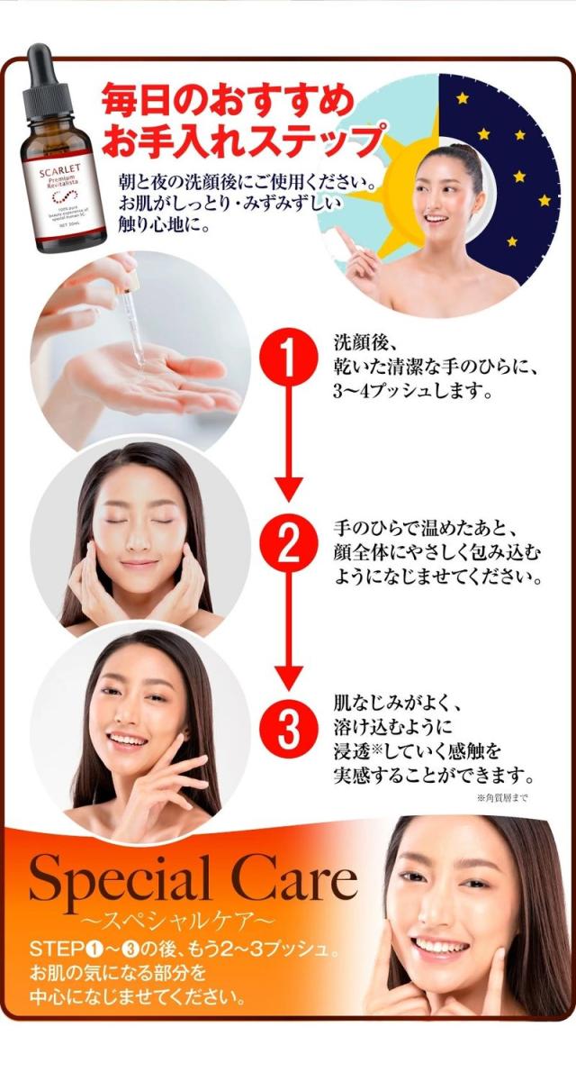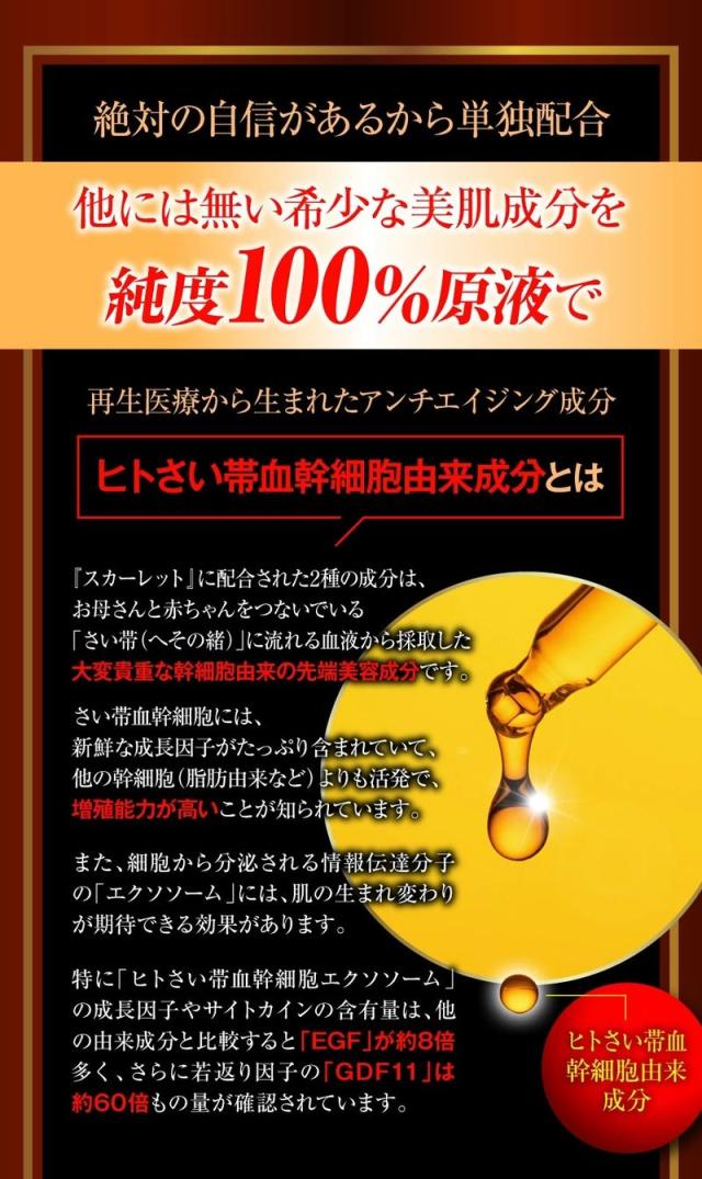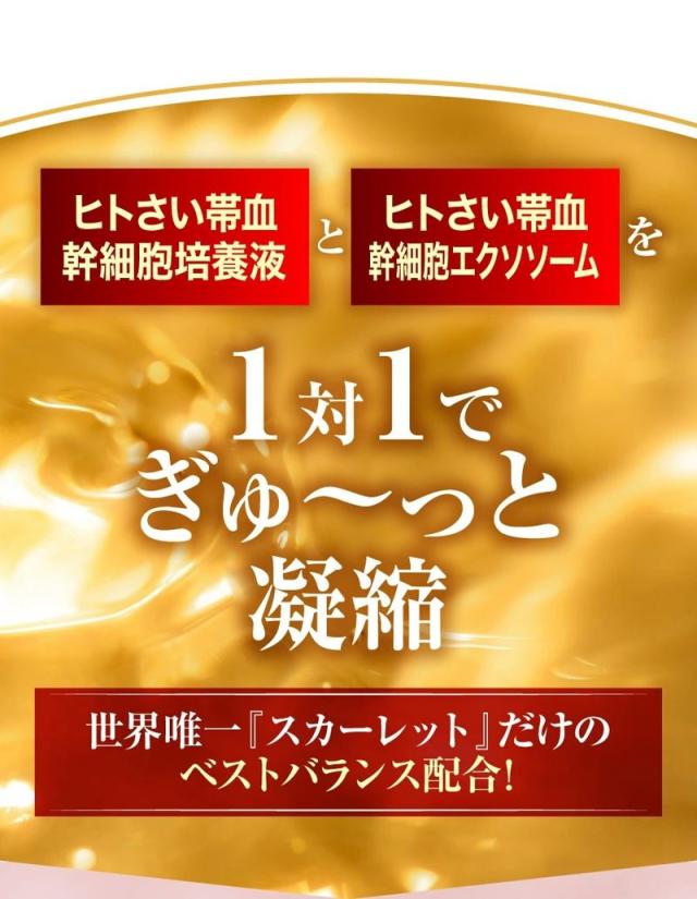 『スカーレット』は、エイジングケア成分の「ヒトさい帯血幹細胞培養液」と「ヒトさい帯血幹細胞エクソソーム」だけに特化した原液美容液です。