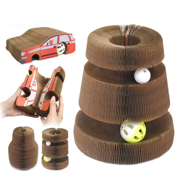 1つのおもちゃで3つの遊び方ができ、花びん型・ツリー型・円柱型の3種類のカタチに変化するので、ねこちゃんも興味を持つこと間違いなし!