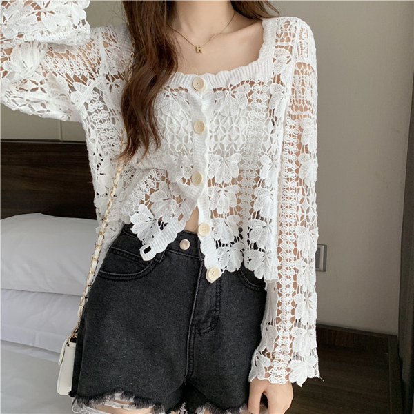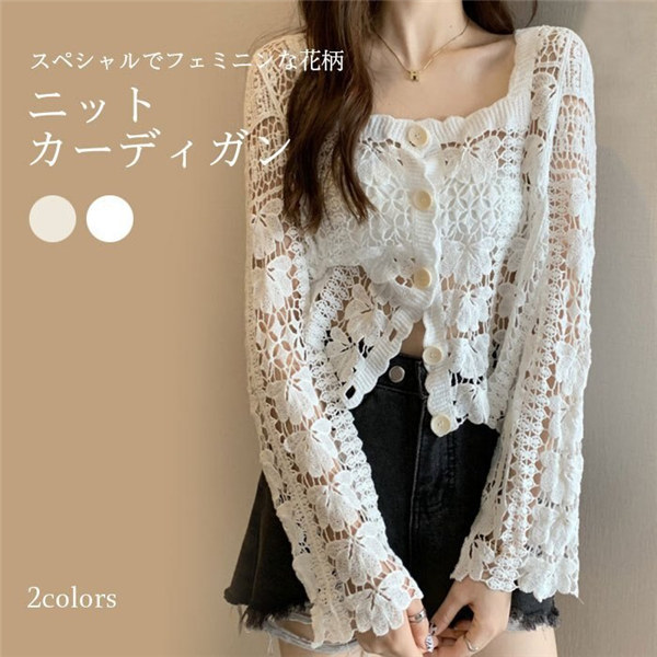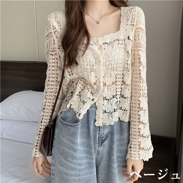 クロシェ編み 夏 トップス サマー ニットカーディガン 透かし編み クロシェニット かぎ編み フロントボタン ボレロ 長袖 ショート セーター 日焼け対策 冷房対策 冷え性対策 de109g4g4zr