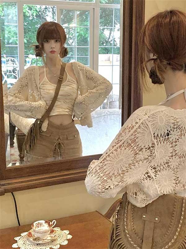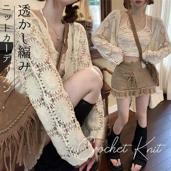 クロシェ編み 夏 トップス サマー ニットカーディガン 透かし編み クロシェニット かぎ編み フロントボタン ボレロ 長袖 ショート セーター 日焼け対策 冷房対策 冷え性対策 eh088x1x1zr