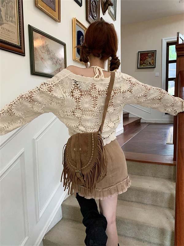 クロシェ編み 夏 トップス サマー ニットカーディガン 透かし編み クロシェニット かぎ編み フロントボタン ボレロ 長袖 ショート セーター 日焼け対策 冷房対策 冷え性対策