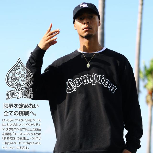 ACE FLAG トレーナー 長袖 スウェット 裏パイル メンズ 黒 大きいサイズ エースフラッグ トップス シンプル Compton コンプトン ビッグシルエット b系 ヒップホップ ファッション ダンス ストリート系 AF-TL-SW-031