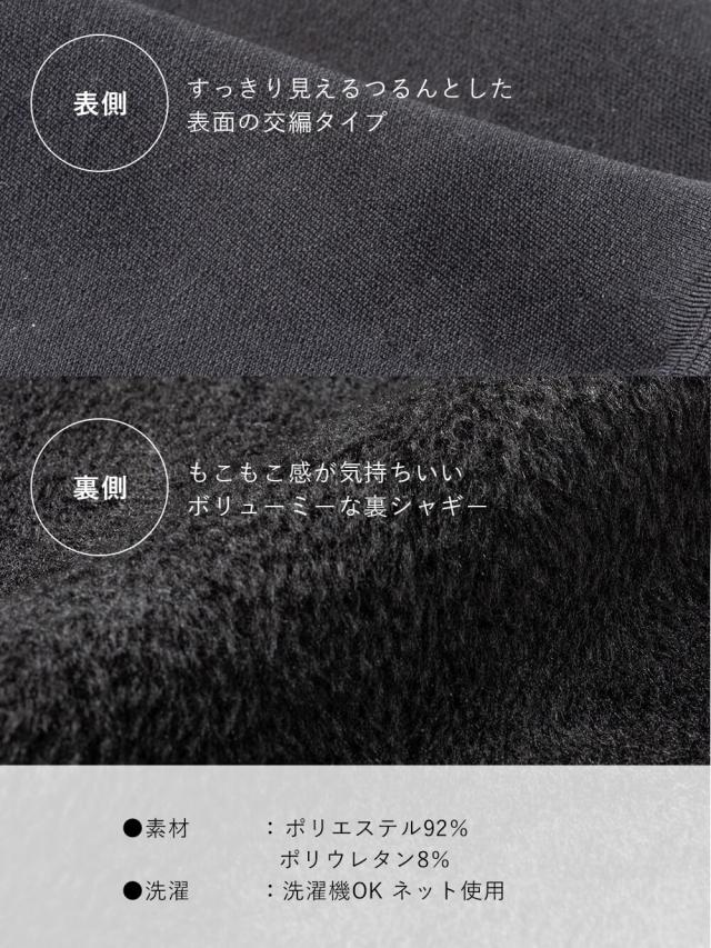 毛足の長い裏シャギー素材のレギンスは、まるで毛布を着ているようなあたたかさ。冬のお出かけに欠かせなくなる極暖アイテムです。表面はシンプルな交編の編地で、つるんとした表面感なので厚地でもすっきり見えるのがポイント。ウエストはゴムを使用していないので締め付けにくく、快適な履き心地です。