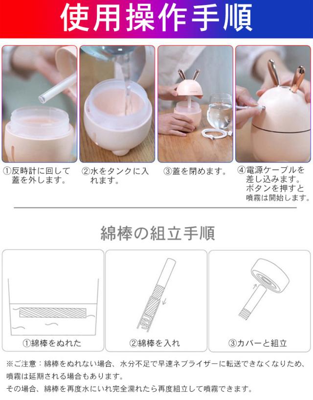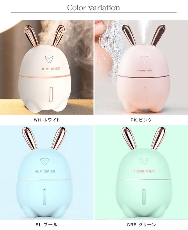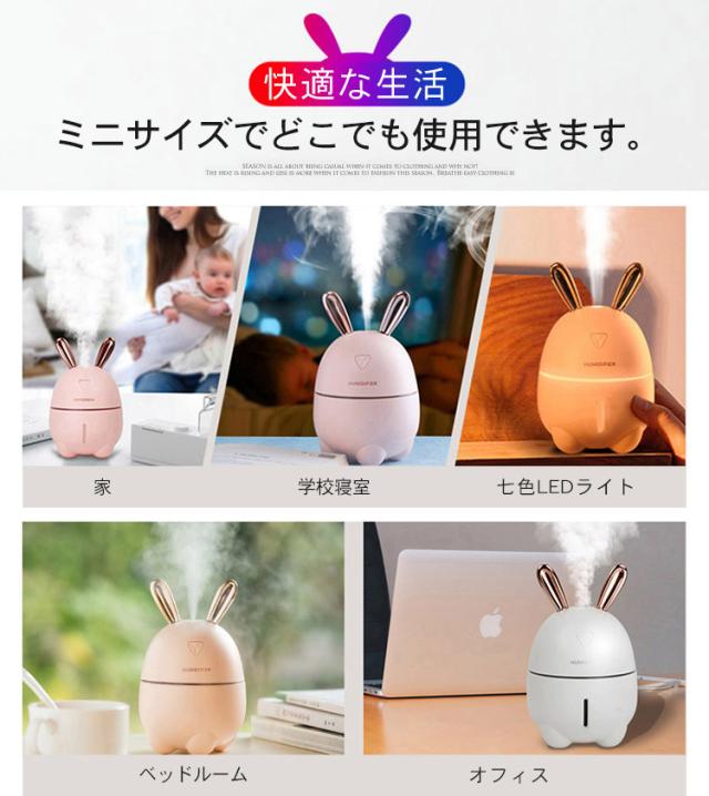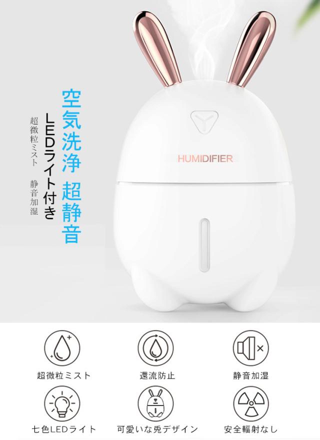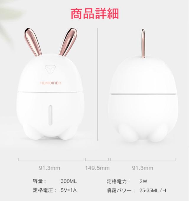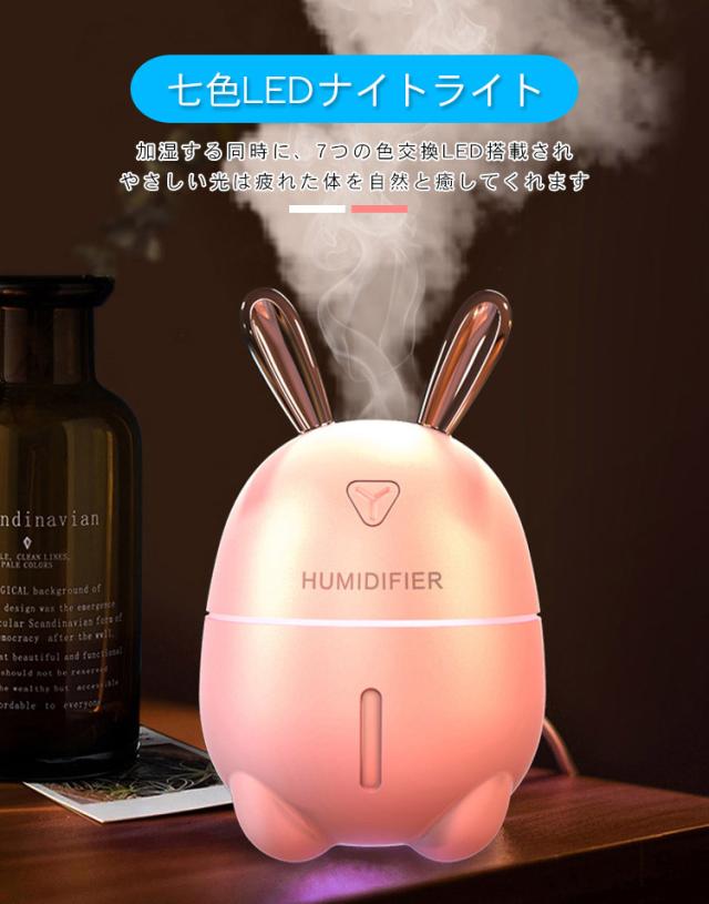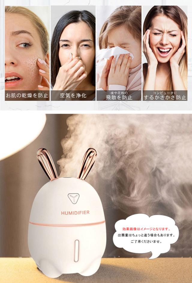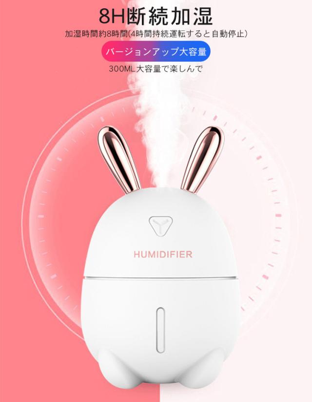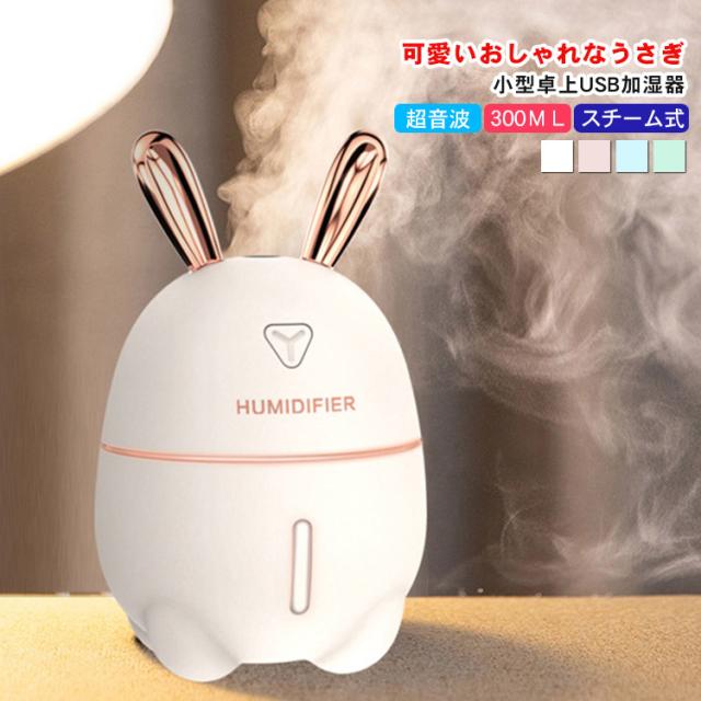加湿器 卓上 小型 超音波 スチーム式 300ML 大出霧量 超微粒ミスト 超静音 ミニ加湿器 運び用 USB 保湿 潤う 美容 健康 7色LEDライト 可愛いおしゃれなうさぎ