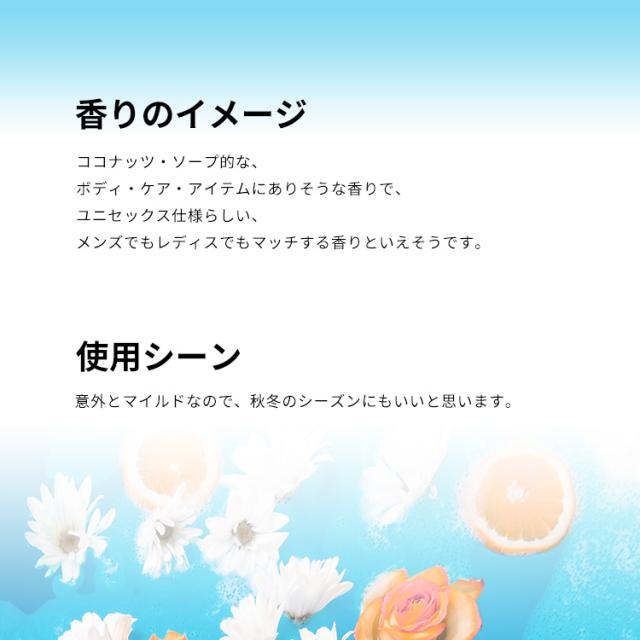 ココナッツ・ソープ的な、ボディ・ケア・アイテムにありそうな香りで、ユニセックス仕様らしい、メンズでもレディスでもマッチする香りといえそうです。意外とマイルドなので、秋冬のシーズンにもいいと思います。オー・ド・トワレ(EDT)ということもあって、かなり軽いのもポイントです。
