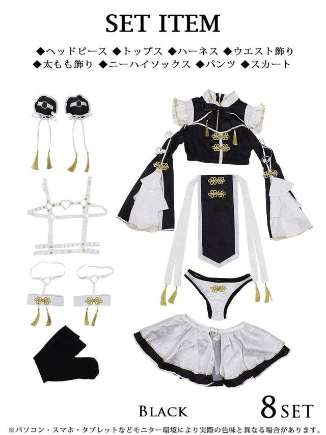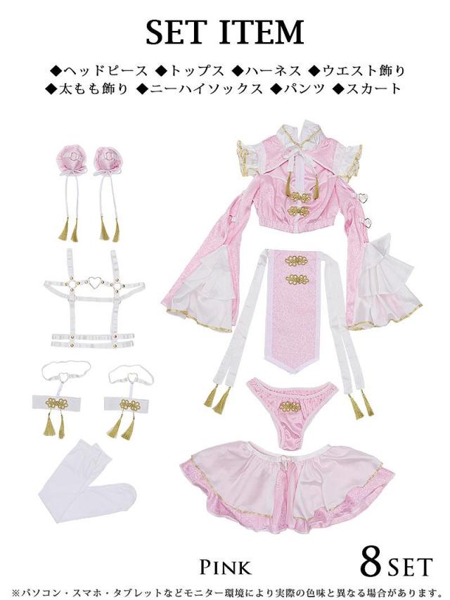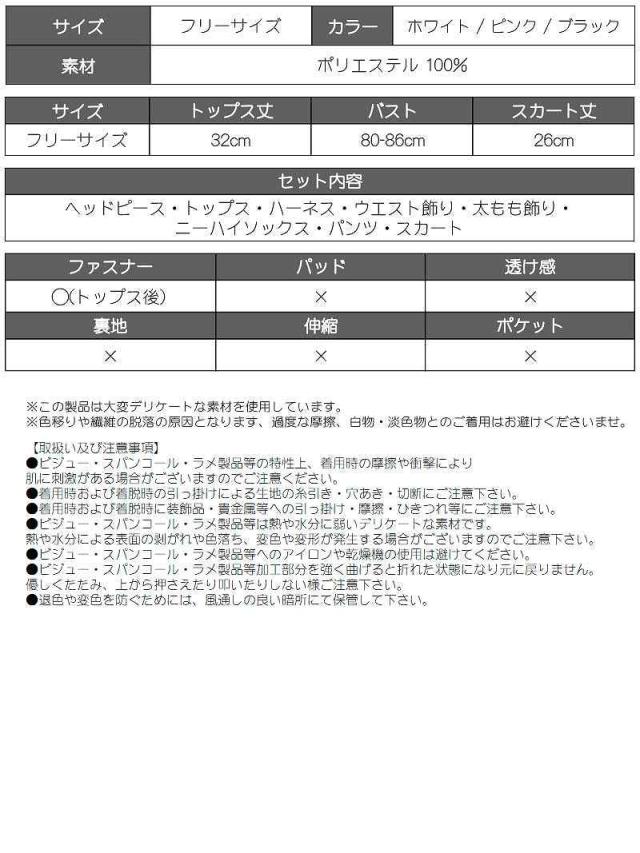 セット内容:ヘッドピース・トップス・ハーネス・ウエスト飾り・スカート・太もも飾り・ニーハイソックス・パンツ