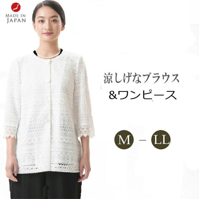 夏用 ホワイト ブラウス&黒ワンピースのアンサンブルコーデスーツ RL109624-16172【総スカラップレース】【日本製】【M〜LL】 結婚式 謝恩会 サマーフォーマル