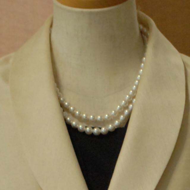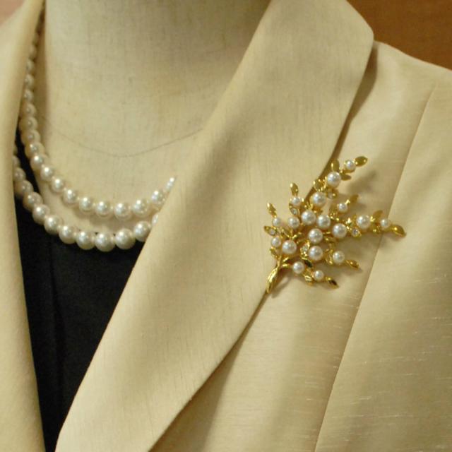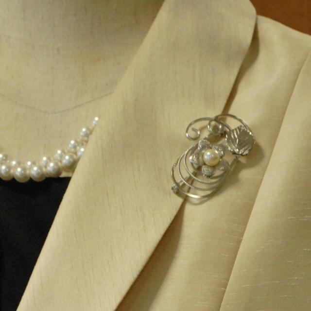 ジャケットは、光沢のあるベージュ色のサテン生地を使用、首まわりから前端にかけてのショールカラーで本格的フォーマル服に見えます。