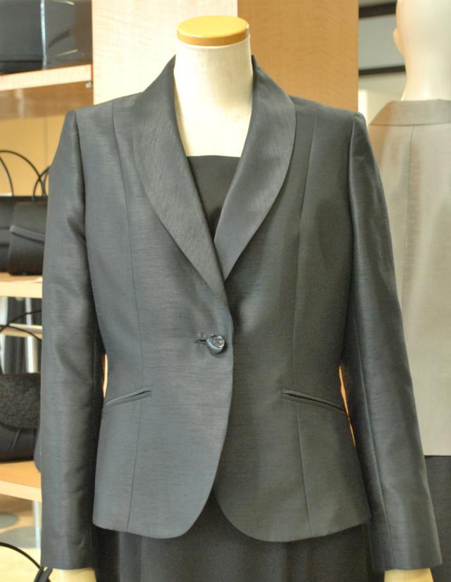 ブラック色の凛としたショールカラージャケットと黒のタイトワンピースを組み合わせたアンサンブル。