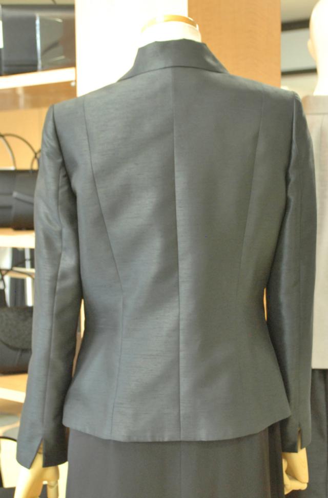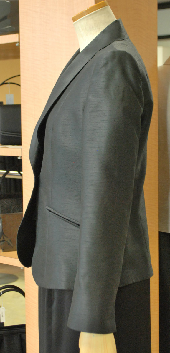 | デザイン | ジャケット: ショールカラー / 肩パッド付き(取り外し不可)/ 総裏地 / 前釦留め / 前ポケット2個 / 袖口スリット ワンピース: 左前ファスナー半開 / 後裾片折れプリーツ / 裏地あり(袖部分なし) |