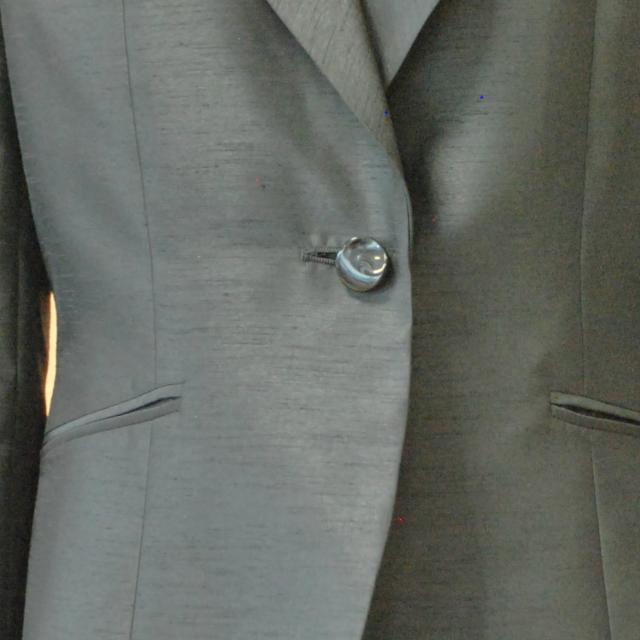 ジャケットは、光沢のある黒色のサテン生地を使用、首まわりから前端にかけてのショールカラーで本格的フォーマル服に見えます。