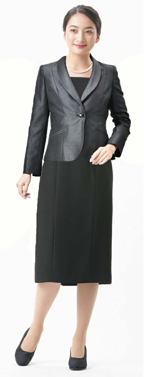 春〜夏秋 日本製 ブラック色アンサンブル セレモニースーツ:RL111022BK-16172 2点セット ショールカラージャケット +タイトライン前開きワンピースのセットアップスーツ 9AR/11AR/13ABR 黒 結婚式 結納式 卒業式 入園式入学式 発表会 準礼装 法事用 礼服 レディス 婦人