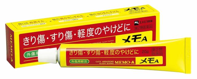 』外傷用軟膏●メモAは、殺菌剤、傷の痛みをしずめる局所麻酔剤、傷の治りをはやめる成分などを配合したなめらかで伸びのよい軟膏です。●有効成分が、きり傷、すり傷、やけどなどにすぐれた効果をあらわします。●ご家庭の常備薬として、またスポーツ時や旅行の際の携帯薬としてご使用いただけます。