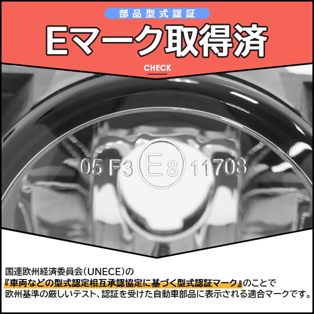 上記の性能で欧州基準の厳しいテストをクリアし、認証を受けた自動車部品に表示するEマーク認証を取得済みです。