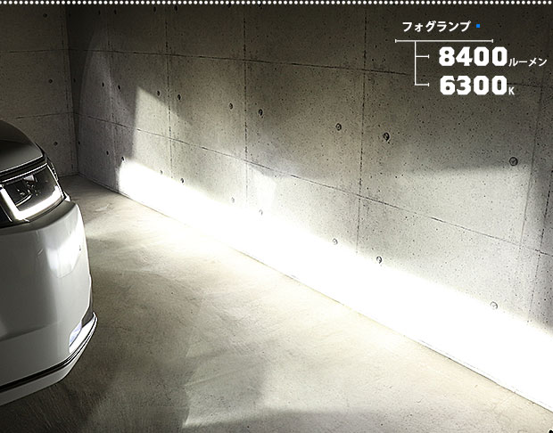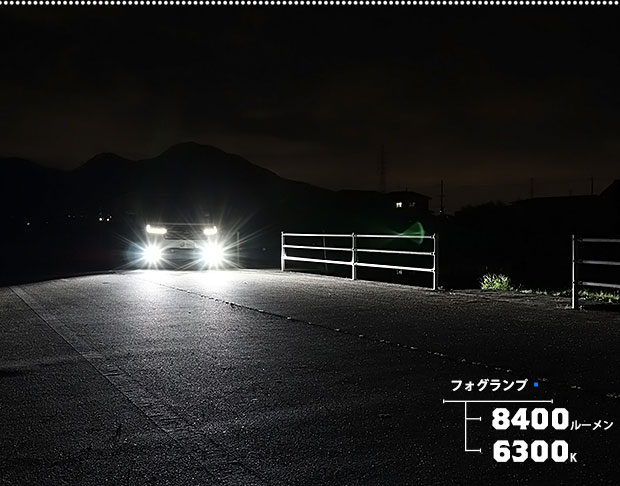 55W ハロゲンランプの明るさ2200lm(※1)を超える十分な光量です。 全光束8400ルーメン(※2)、最強のモンスター級フォグランプ用LEDバルブキットです。