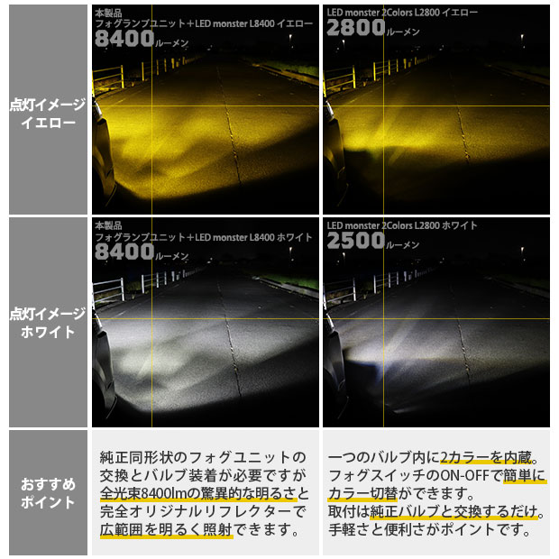 革新的な進化を遂げ、全光束8400lmの明るさを持ち、色温度6300KのLEDフォグランプキット『LED monster L8400』の性能を最大限に引き出します。