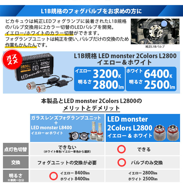 純正LEDフォグランプユニットは新しい規格L1BのLEDバルブが採用されており、従来の明るいLEDフォグバルブが使用できません。