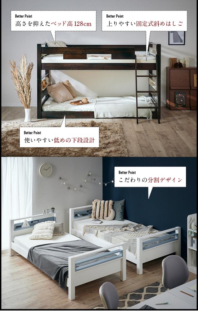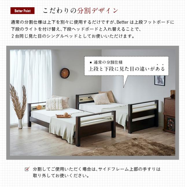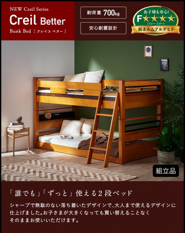 二段ベッド 2段ベッド Creil Better(クレイユ ベター) 3色対応 子供 大人用 ベッド ロータイプ 分割可能 分離 シングルベッド すのこベッド 木製 子供部屋 おしゃれ コンセント 照明 耐震設計 耐荷重700kg