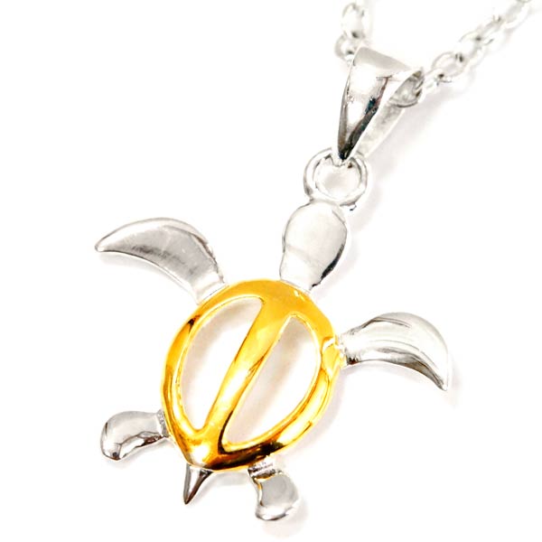 ハワイアンジュエリー人気No1モチーフ・ホヌ/ウミガメデザインメンズ&レディースシルバー925ペンダントネックレスです。丸いフォルムが特徴的で人気の高い透かしタイプのペンダントです。甲羅部分にのみイエローゴールドのコーティングを使い、南国ハワイを想わせるトロピカルなイメージに仕上げられています。ホヌ本体で縦16mmと小型サイズですので様々なスタイルに合わせやすく女性の方はもちろん男性にもお勧めです。バチカン裏側には高品質なシルバーの証「925」の刻印が入っておりあずきチェーンがセットとなっています。カメモチーフ好きな方やまだハワイアンジュエリーをお持ちでない方にもぜひお勧めするホヌシルバーペンダントネックレスです。
