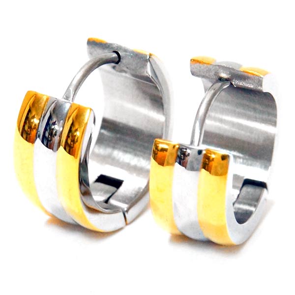 ゴールド&シルバーバイカラー 立体型3ラインデザイン メンズ レディース ステンレス フープ ピアス【7mm幅】