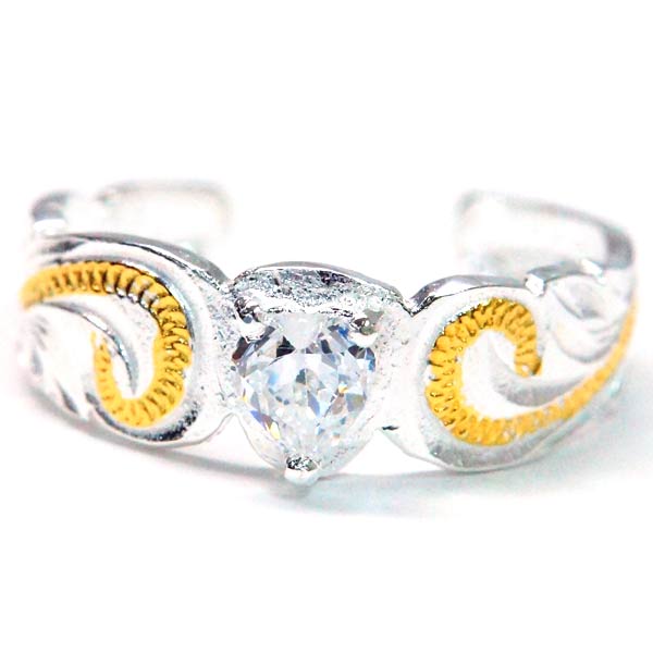 可愛いハートの形が女性に人気のハートシェイプカットストーンを使ったハワイアンジュエリーレディースシルバー925トゥーリングです。装飾のメインとなるクリアジルコニアは女性らしい雰囲気漂うハートシェイプカットで仕上げられ可憐な存在感を十二分に発揮しています。透き通るような輝きは可愛らしさだけではなく煌びやかな大人の雰囲気も十分。リング本体の装飾にはアームの後方まで続く「スクロール」の波模様が刻まれています。モチーフの輪郭に沿って造形されたカットアウトのデザインがスクロールの美しいシルエットを際立たせています。さらに部分的に使ったイエローゴールドの輝きが南国ハワイを想わせるトロピカルなイメージに仕上げられています。リング内側には高品質なシルバーの証「925」の刻印入り。ピンキーリングとしても使える2WAYタイプですので季節を華やかに彩るアクセサリーをお探しの方にお勧めするハワイアンジュエリーレディースシルバー925トゥーリングです。