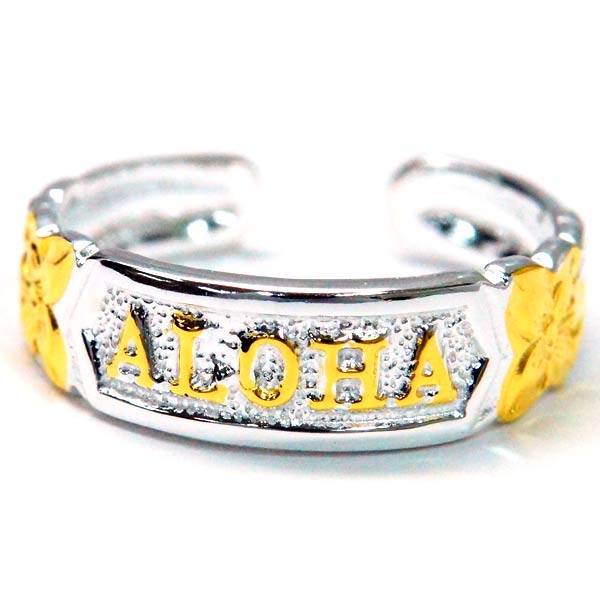 誰もがお馴染みのハワイの言葉「ALOHA/アロハ」文字をメインとしたハワイアンジュエリーレディースシルバー925トゥーリングです。ALOHA文字はレイズドと呼ばれる浮き彫り技法で立体感を出したデザインで、文字の周囲に無数に付けられた凹凸が光を反射してキラキラと輝きを放ってくれます。文字には色鮮やかなイエローゴールドコーティングを使いハワイらしいトロピカルな雰囲気も十分。アロハ文字の両側にはプルメリア&スクロールが刻み込まれリングデザインに華やかで美しい彩りを添えています。リング全体には「プラチナ仕上げ」と呼ばれるホワイトロジウムのコーティングで高級感をプラス。内側には高品質なシルバーの証「925」の刻印入り。大人びたイメージとハワイの雰囲気漂うこちらのトゥーリングはピンキーリングとしても使えるお得な2WAYとなっていますのでまだハワイアンジュエリーをお持ちでない方にもぜひお勧めするレディースシルバー925トゥーリングです。