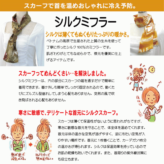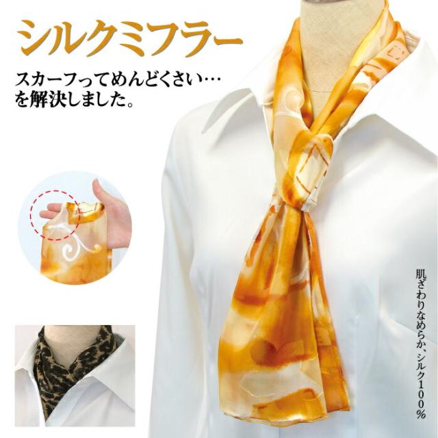 【シルク レディース ミニマフラー】シルクミフラーワンタッチ スカーフ 天然素材 シルク 絹 100% ハンドメイド マフラー 襟元 首元 おしゃれ かわいい アクセント 軽い かさばらない 巻き方簡単 穴に通すだけ 首筋 日焼け UV対策 冷房対策 寒さ対策 プレゼント