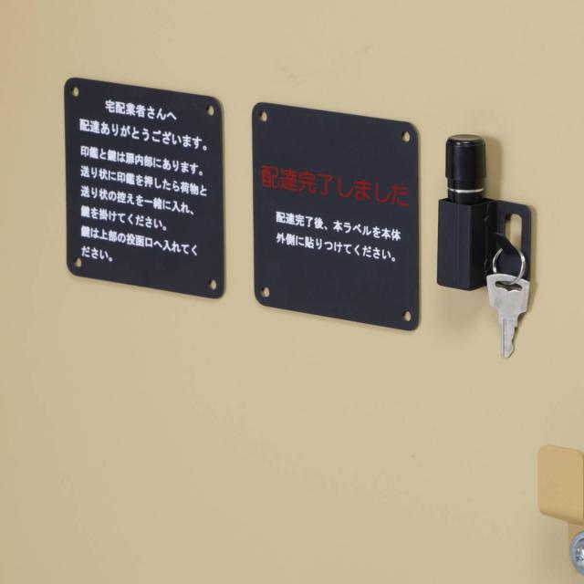 宅配業者用の配達マニュアルと配達が完了したことが分かる2種類のメッセージプレート付きです。マグネット式でお好きな場所に貼付けできます。印鑑ホルダーと施錠用のキーフック付きです。