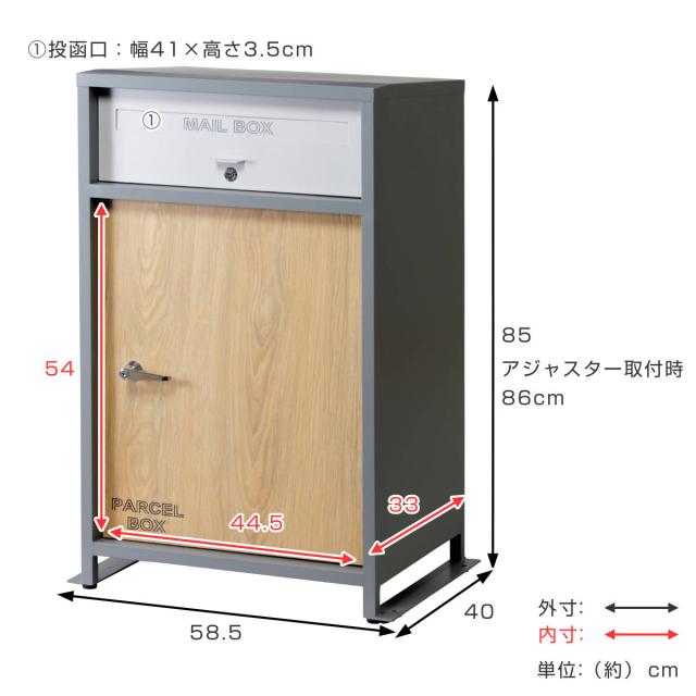 | サイズ | 約 幅58.5×奥行40×高さ85(cm) アジャスター取付時の高さ:約86cm 投函口サイズ:約幅41×高さ3.5cm 収納ボックス(下)内寸:約幅44.5×奥行33×高さ54cm |