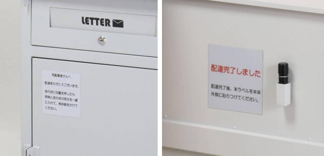 宅配業者用の配達マニュアルと配達が完了したことが分かる2種類のメッセージプレート付きです。マグネット式でお好きな場所に貼付けできます。印鑑ホルダー付きです。