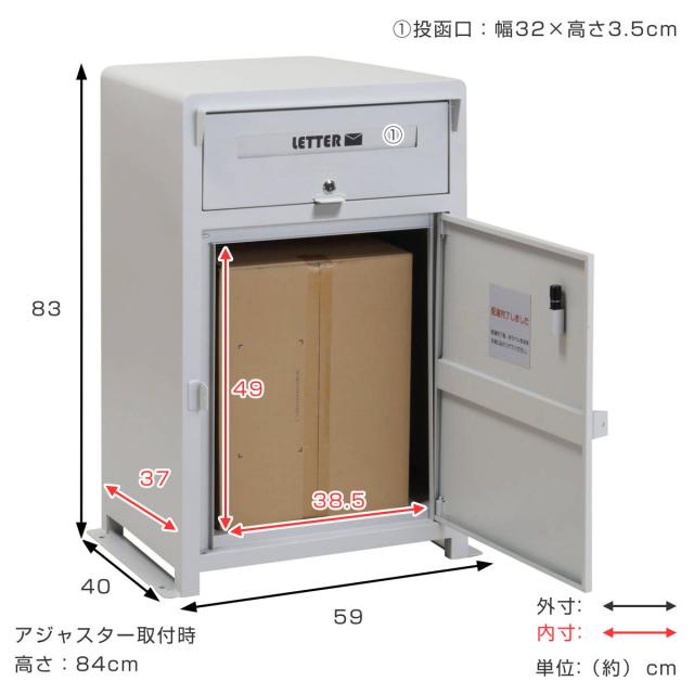 | サイズ | 約 幅59×奥行40×高さ83(cm) アジャスター取付時の高さ:約84cm 投函口サイズ:約幅32×高さ3.5cm 収納ボックス(下)内寸:約幅38.5×奥行37×高さ49cm |