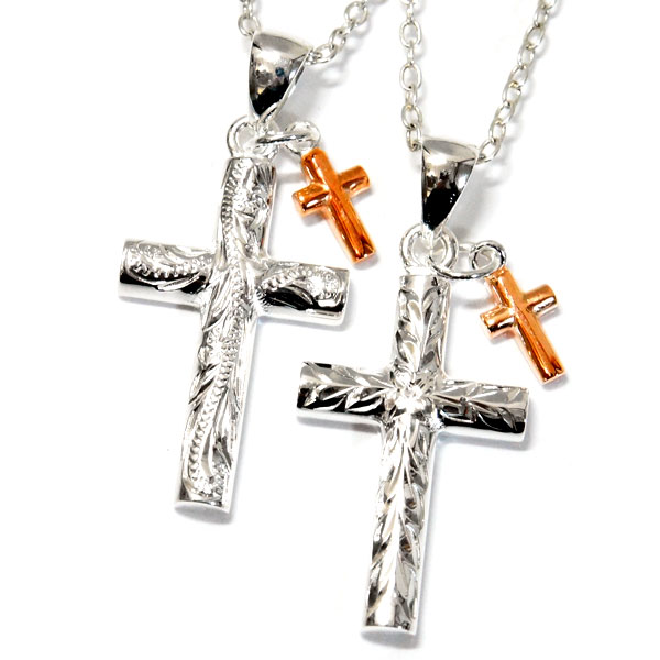 ハワイアンジュエリー ペンダント ネックレス クロス 十字架 ピンクゴールド ミニチャーム シルバー925 【波彫り/葉柄彫り】