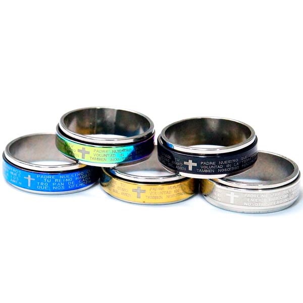 リング表面に聖書文字と十字架を刻んだステンレススピンリングです。表面に刻まれた聖書文字&十字架の彫り模様がとても際立ち神秘的な雰囲気が漂っていますね。文字入りのデザインはシンプルながらも存在感抜群で幅広い世代から大変人気があります。カラー部分を指で回せる可動式のスピンリングにするなど遊び心も十分感じさせるデザインとなっています。