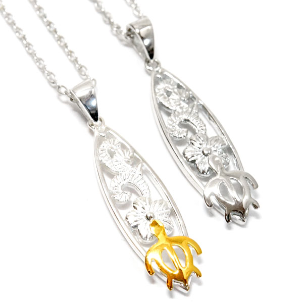 ハワイアンジュエリー ネックレス サーフボード ホヌ ウミガメ プルメリア 花 シルバー925 【シルバー/イエローゴールド】