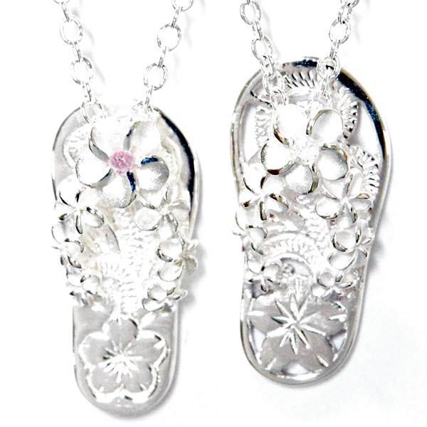 ハワイアンジュエリー ネックレス ビーチサンダル プルメリア 花緒 スクロール ジルコニア シルバー925 【ピンク/クリア】