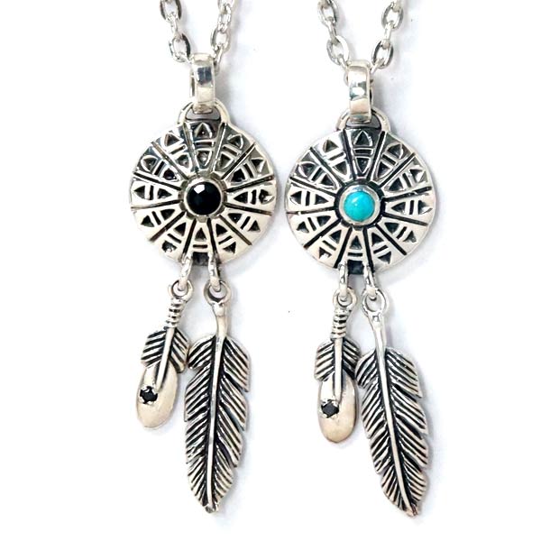 インディアンジュエリー 天然石 フェザー 羽 ラウンドプレート シルバー925 ペンダント ネックレス 【ターコイズ/オニキス】
