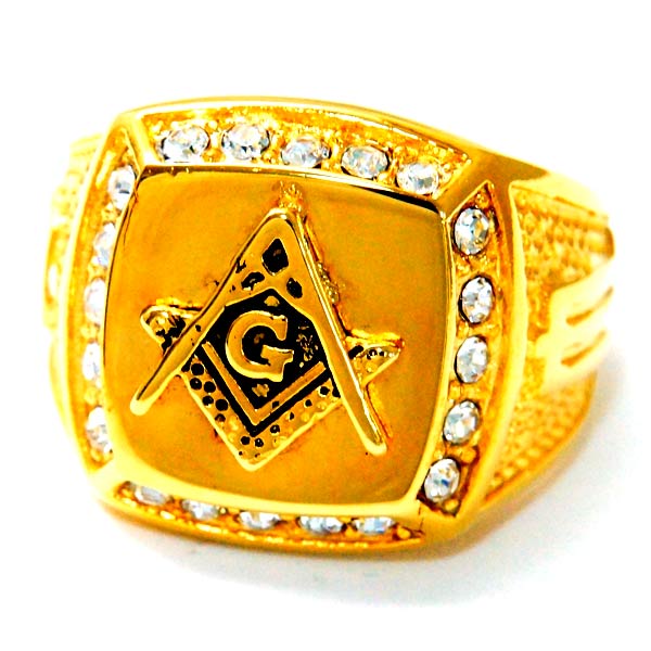 秘密結社 フリーメイソン シンボルマーク クリアビーズ イエローゴールド 金色 メンズ リング 指輪