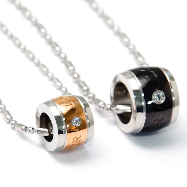 【永遠の愛】 メッセージ刻印 クリアジルコニア バレル型 ステンレス ペアネックレス お揃い ペンダント ネックレス 【ブラック/ピンクゴールド】