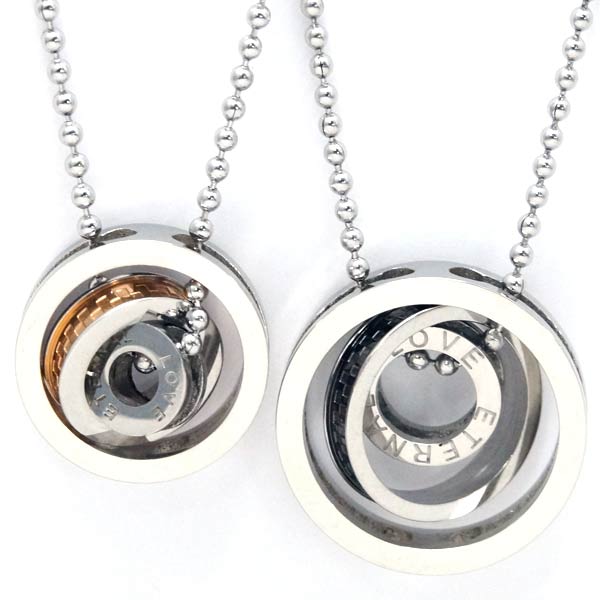【永遠の愛】 文字刻印 チェック模様 格子柄 3連リング ステンレス ペアネックレス お揃い ペンダント ネックレス 【ピンクゴールド/ブラック】
