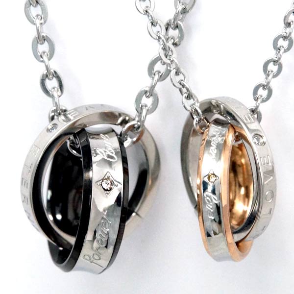 【永遠の愛】 文字刻印 クリアジルコニア 埋め込み リング 2連 ステンレス ペアネックレス お揃い ペンダント ネックレス【ピンクゴールド/ブラック】