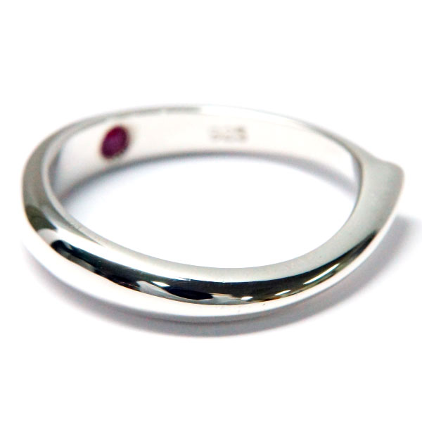 7月の誕生石として有名なルビーを使ったレディースシルバージュエリーリングです。とてもシンプルなデザインのリング内側部分には、石の名が示すとおりルビーレッドの妖艶で美しい輝きが装飾されています。あえて内側にルビーを装飾したデザインが意味深なイメージですね。リング表側のフレーム部分はとてもシンプルなデザインながらも、厚みを変え一部分のみを少しとがらせたことで変化を持たせています。リング内側には高品質なシルバーの証「925」の刻印入り。ルビーはダイヤモンド・サファイア・エメラルドと並ぶ4大宝石のひとつで「宝石の女王」とも呼ばれています。『勝利を象徴する石』と言われ「栄光・愛情・情熱・慈悲・威厳」などの意味を持っています。