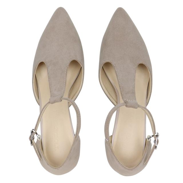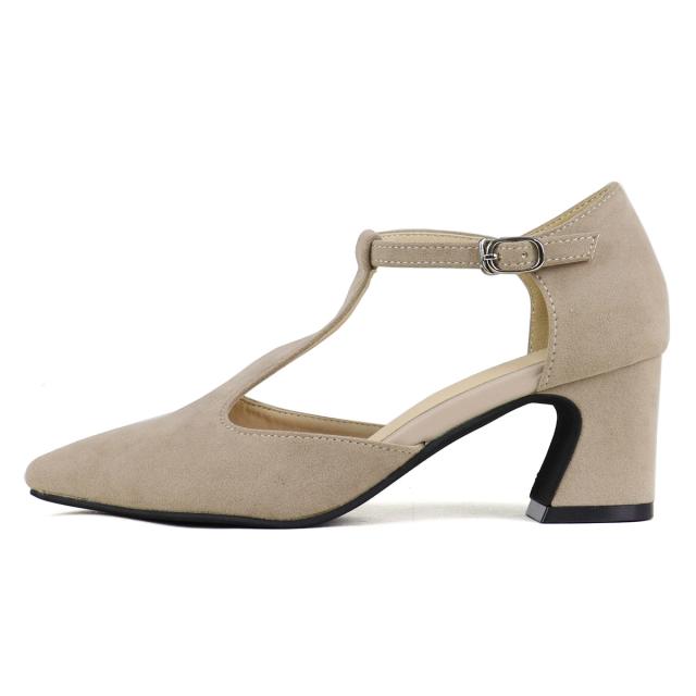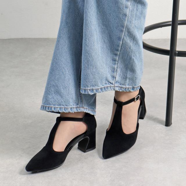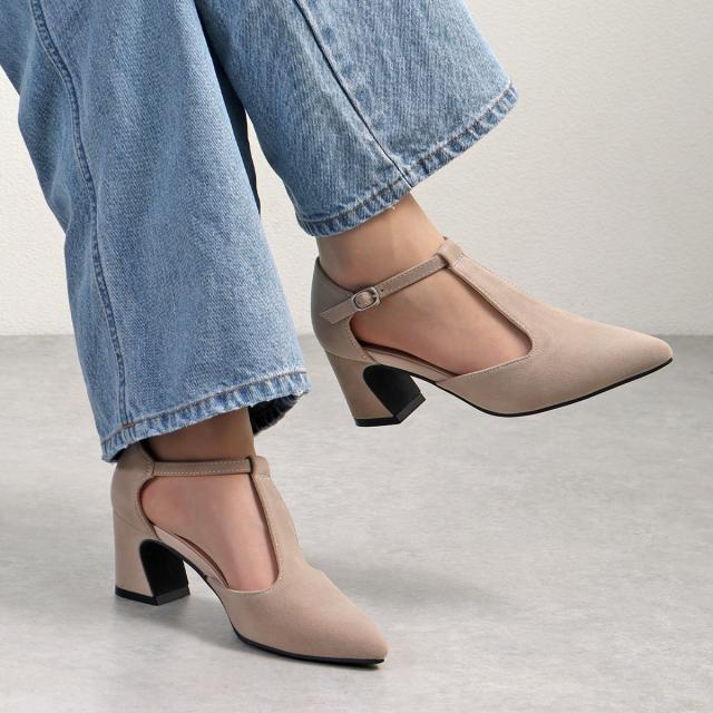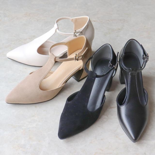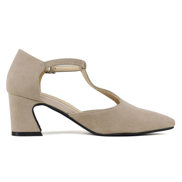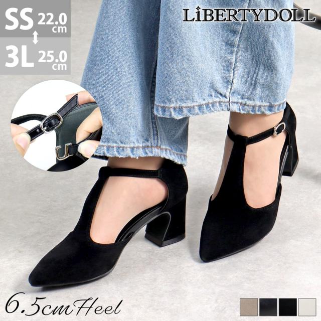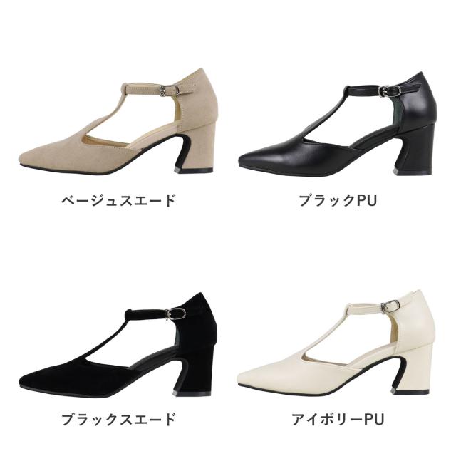 パンプス ポインテッドトゥ 6.5cmヒール 変形ヒール レディース Tストラップ 合皮 スエード ブラック ベージュ アイボリー 22-25cm リバティードール No.1189