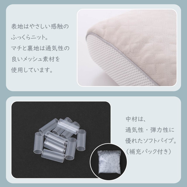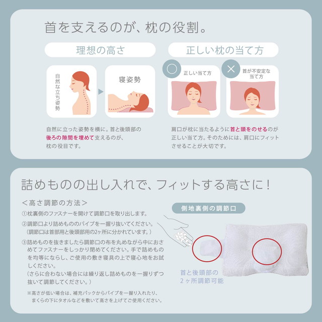 ◆お好みに合わせて首部と後頭部の2箇所の高さ調整ができます。補充用パイプを付属しているので、高さが足りないときにはパイプを足してください。逆に枕が高いと感じるときにはパイプを抜いて調整してください。