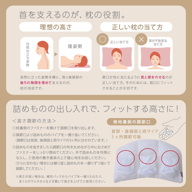 ◆両サイドと中央部の3箇所の高さ調整が可能。横向き寝用の両サイドが独立しているので、お好みの高さに調整できます。付属の補充用パイプを使って、詰めものを抜き差しして調整してください。